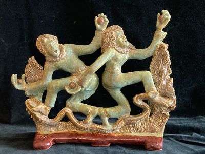 Since 2014, I have sculpted most of my small ceramic works using low-fire clay at a nearby senior center. Drawing on my theatrical background and a long-standing interest in Greek and Roman theatre, I have been particularly interested in masks and mythic themes. Most of these low-fire works are small, 8 to 9 inches tall, and either glazed or painted.